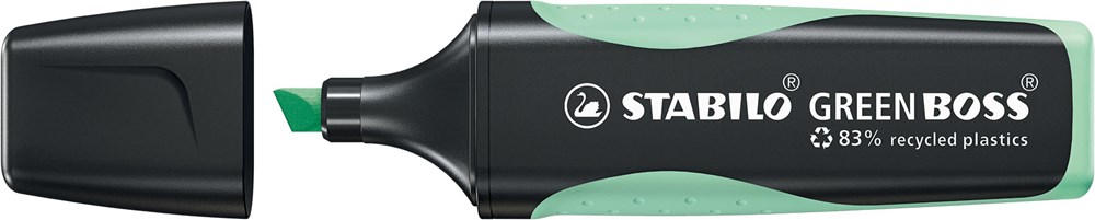 GRÜNES GEWISSEN BEI VOLLER LEUCHTKRAFT. Textmarker aus 83% recyceltem Kunststoff in klassischer STABILO BOSS Form mit weicher, ergonomischer Griffzone. 2 Strichstärken, nachfüllbare Tinte in 4 trendigen Pastellfarben. Intelligente Anti-Dry-Out-Technologie mit 4 Stunden Austrockenschutz. Auch in 4 kräftigen Leuchtfarben erhältlich.