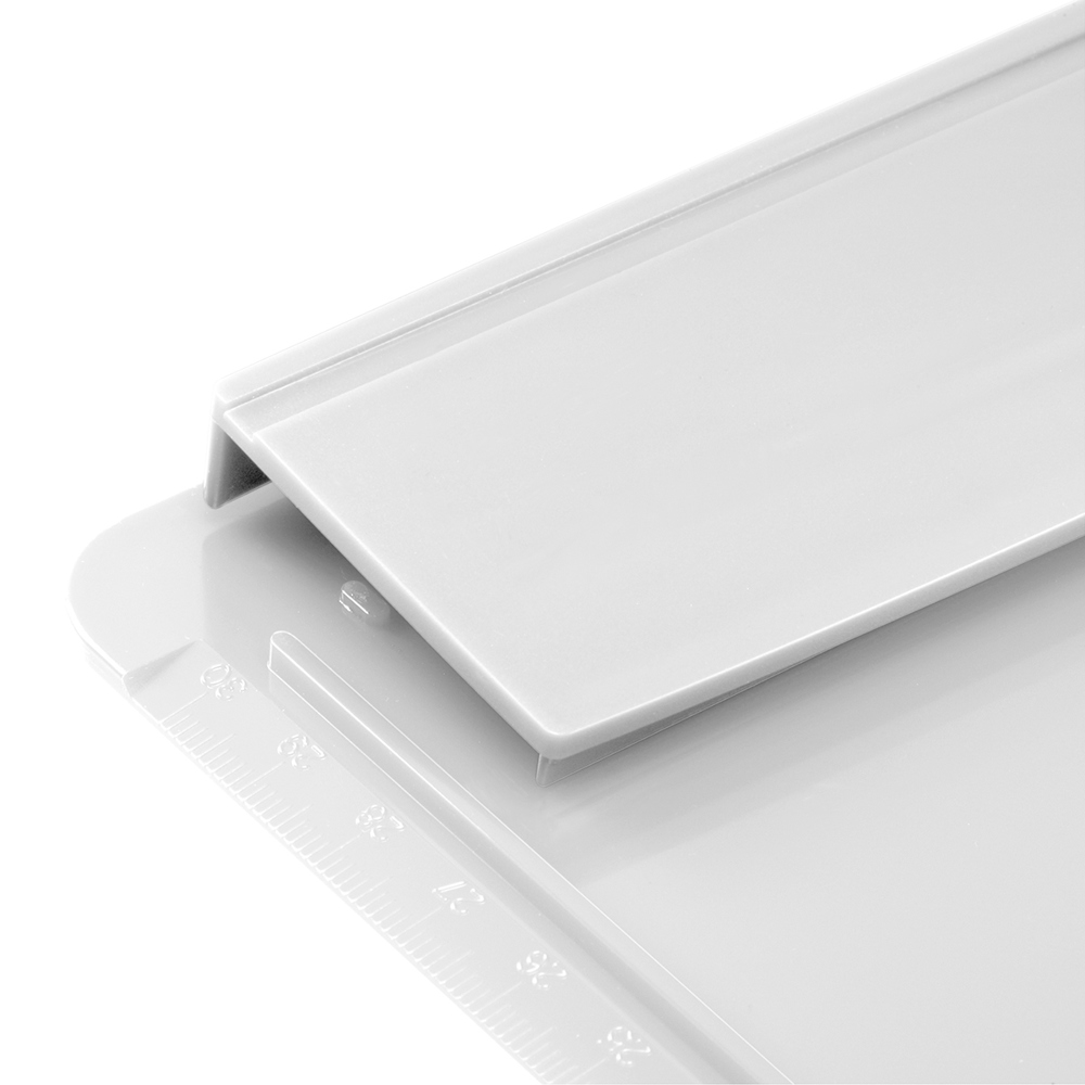 mit vertiefter Stiftehalterung in der Klemmleiste, für Links- und Rechtshänder, seitlichem Anschlag sowie 30 cm Skala, mit 4 geräuschdämpfenden Filzpunkten auf der Plattenrückseite, ohne Druckkugelschreiber, ohne Papier