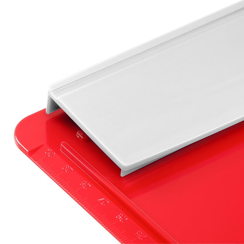 mit vertiefter Stiftehalterung in der Klemmleiste, für Links- und Rechtshänder, seitlichem Anschlag sowie 30 cm Skala, mit 4 geräuschdämpfenden Filzpunkten auf der Plattenrückseite, ohne Druckkugelschreiber, ohne Papier