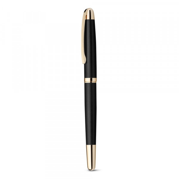 Rollerball aus Metall mit Clip und goldenen Details. Blauschreibende Mine. Geliefert in einem Geschenketui aus Kraftpapier. ø11 x 140 mm | Schachtel: 180 x 43 x 22 mm