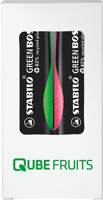 GRÜNES GEWISSEN BEI VOLLER LEUCHTKRAFT. Schreibset mit 2 Textmarkern STABILO GREEN BOSS im weißen Karton-Etui. Textmarker aus 83% recyceltem Kunststoff in klassischer Form mit weicher, ergonomischer Griffzone. 2 Strichstärken, nachfüllbare Tinte. Intelligente Anti-Dry-Out-Technologie mit 4 Stunden Austrockenschutz.