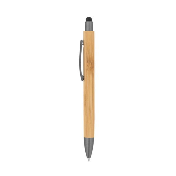 Kugelschreiber aus Bambus mit Clip aus Metall, PP Elemente und matter Oberfläche. Mit einer Schwarz Touchpenfunktion. Schwarzschreibende Mine. Da das Produkt aus natürlichen Materialien hergestellt wird, können Farbe des Produkts sowie das Druckergebnis von Produkt zu Produkt unterschiedlich sein. Ø11 x 141 mm