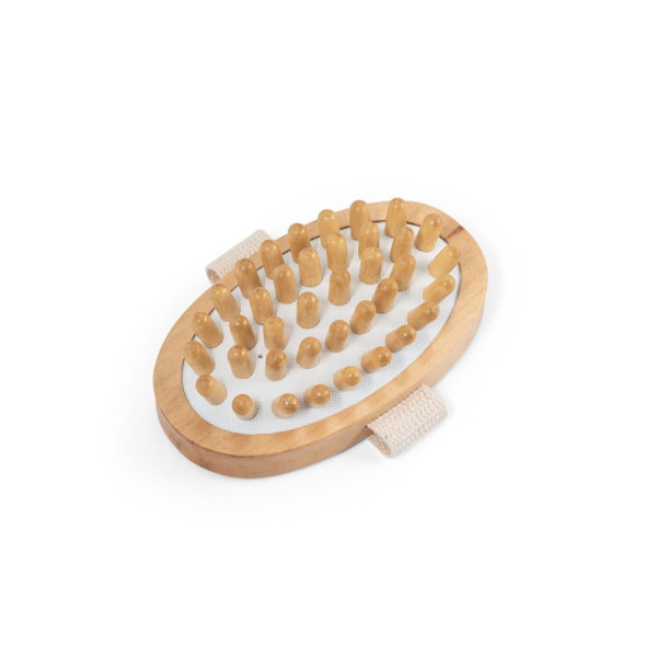 Massagebürste aus Holz (250 g/m²) mit einem Halteband aus Baumwolle, der das massieren leichter macht. Geliefert in einer Schachtel aus Kraftpapier. Da das Produkt aus natürlichen Materialien hergestellt wird, können Farbe des Produkts sowie das Druckergebnis von Produkt zu Produkt unterschiedlich sein. Massagebürste: 130 x 75 x 40 mm | Schachtel: 135 x 80 x 45 mm