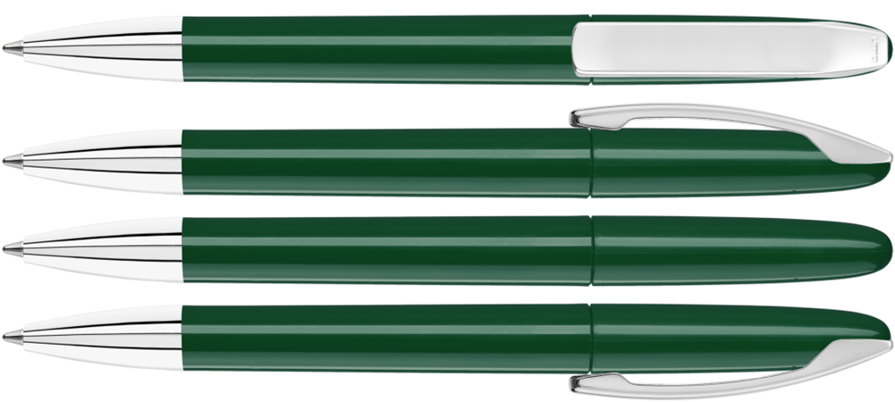 Drehkugelschreiber mit gedeckt glänzendem Gehäuse, Metallclip und Spitze glanzverchromt.