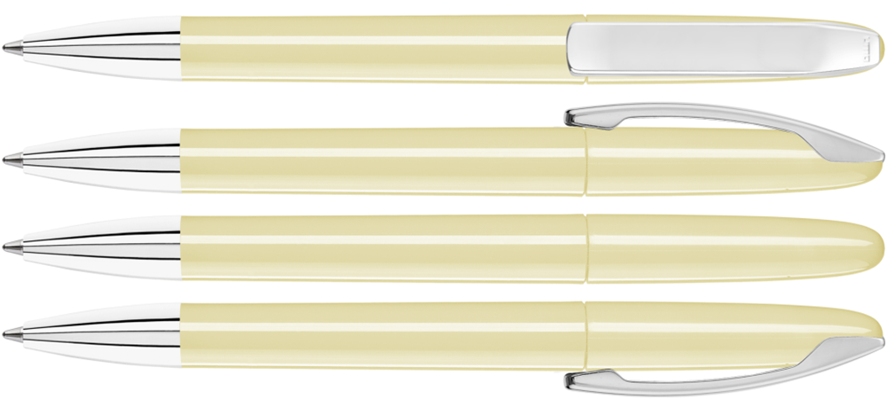 Drehkugelschreiber mit gedeckt glänzendem Gehäuse, Metallclip und Spitze glanzverchromt.