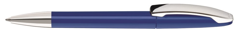 Drehkugelschreiber mit gedeckt glänzendem Gehäuse, Metallclip und Spitze glanzverchromt.