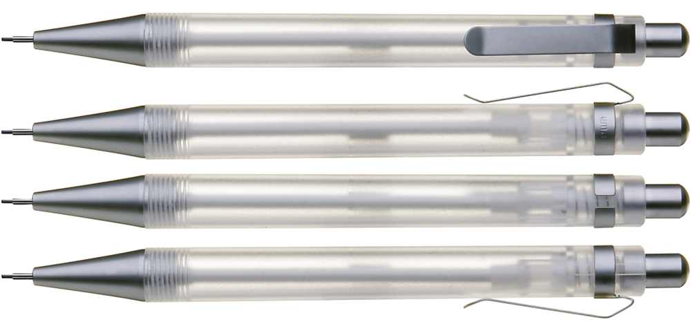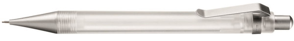 Druckbleistift (0,7mm) mit transparent gefrostetem oder gedecktem Gehäuse. Metalldrücker, Metallclip und Metallspitze matt verchromt.