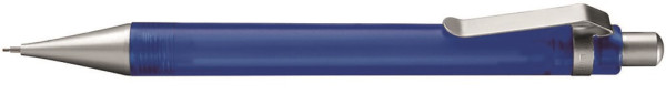 Druckbleistift (0,7mm) mit transparent gefrostetem oder gedecktem Gehäuse. Metalldrücker, Metallclip und Metallspitze matt verchromt.