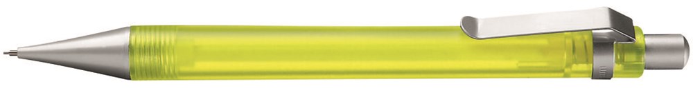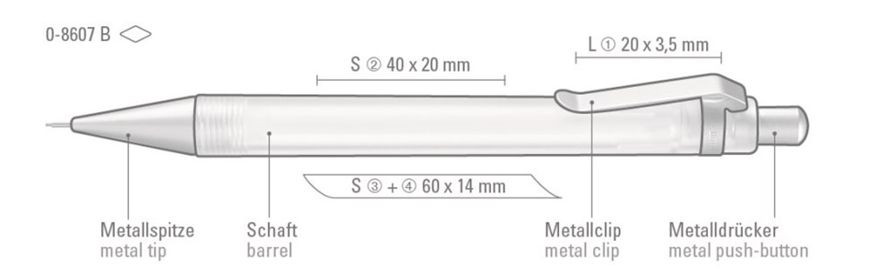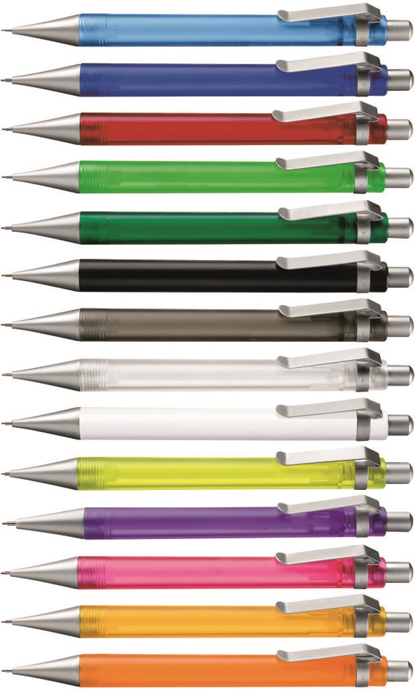 Druckbleistift (0,7mm) mit transparent gefrostetem oder gedecktem Gehäuse. Metalldrücker, Metallclip und Metallspitze matt verchromt.