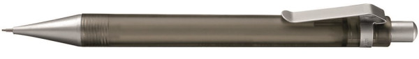 Druckbleistift (0,7mm) mit transparent gefrostetem oder gedecktem Gehäuse. Metalldrücker, Metallclip und Metallspitze matt verchromt.