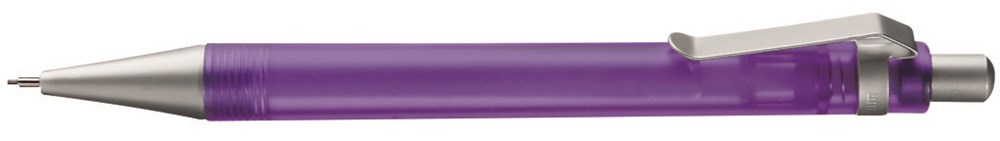 Druckbleistift (0,7mm) mit transparent gefrostetem oder gedecktem Gehäuse. Metalldrücker, Metallclip und Metallspitze matt verchromt.