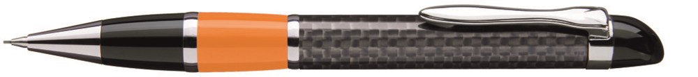 Edler Carbonfaser Metalldrehbleistift (0,7mm) mit farbiger Griffzone, flexiblem Metallclip, Metallzierring und Metallspitze glanzverchromt.