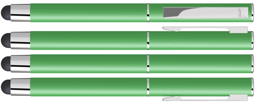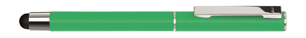 Metall-Rollerball mit mattem Gehäuse. Metallclip und Zierring silber glänzend, Griffzone schwarz. Gummiertes Schaftende für die Touchscreensteuerung.