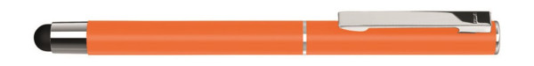 Metall-Rollerball mit mattem Gehäuse. Metallclip und Zierring silber glänzend, Griffzone schwarz. Gummiertes Schaftende für die Touchscreensteuerung.