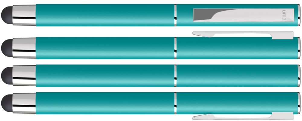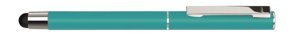Metall-Rollerball mit mattem Gehäuse. Metallclip und Zierring silber glänzend, Griffzone schwarz. Gummiertes Schaftende für die Touchscreensteuerung.