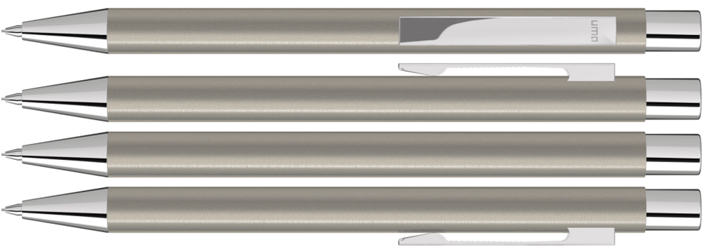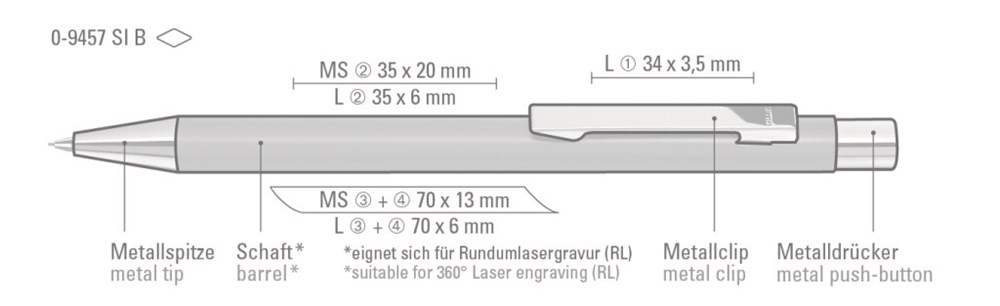Metall-Druckbleistift (0,7mm) mit mattem Gehäuse. Metallclip, Metallspitze und Drücker silber glänzend. Radiergummi im Drücker.