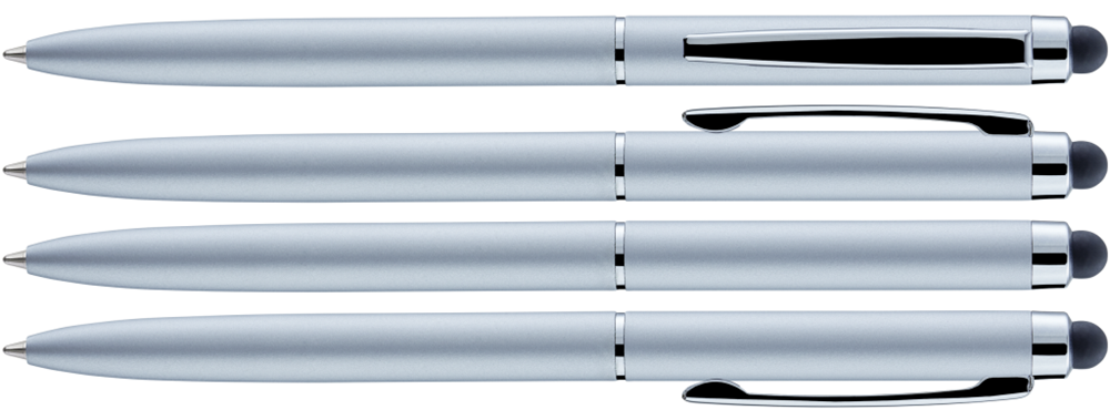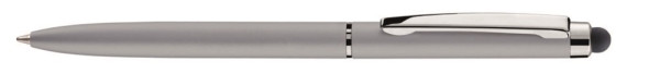 Metall-Drehkugelschreiber mit farbig mattem oder weiß glänzendem Gehäuse und silber glänzenden Beschlagteilen. Gummiertes Schaftende für die Touchscreensteuerung.