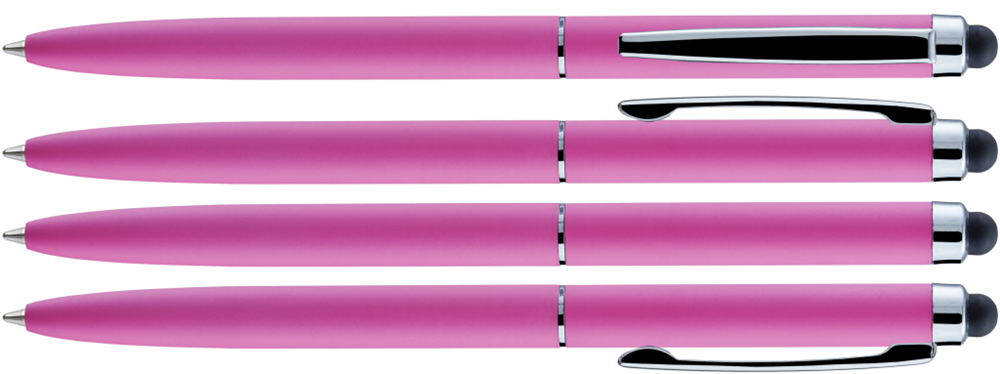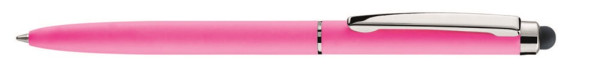 Metall-Drehkugelschreiber mit farbig mattem oder weiß glänzendem Gehäuse und silber glänzenden Beschlagteilen. Gummiertes Schaftende für die Touchscreensteuerung.