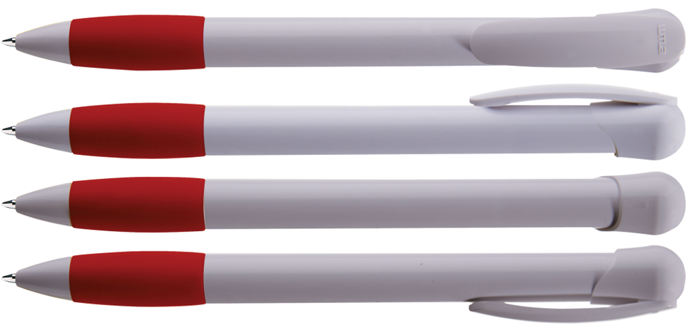 Druckkugelschreiber mit gedeckt glänzendem Gehäuse und Clipdrücker in weiß, farbige Gummigriffzone und Stopfen.