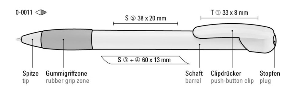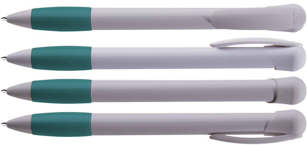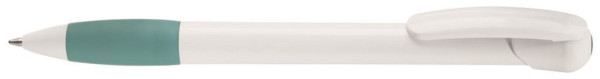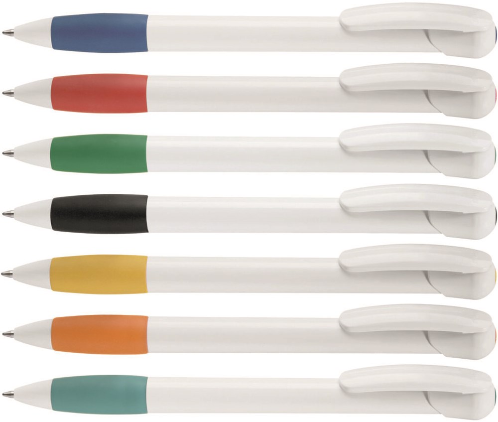 Druckkugelschreiber mit gedeckt glänzendem Gehäuse und Clipdrücker in weiß, farbige Gummigriffzone und Stopfen.