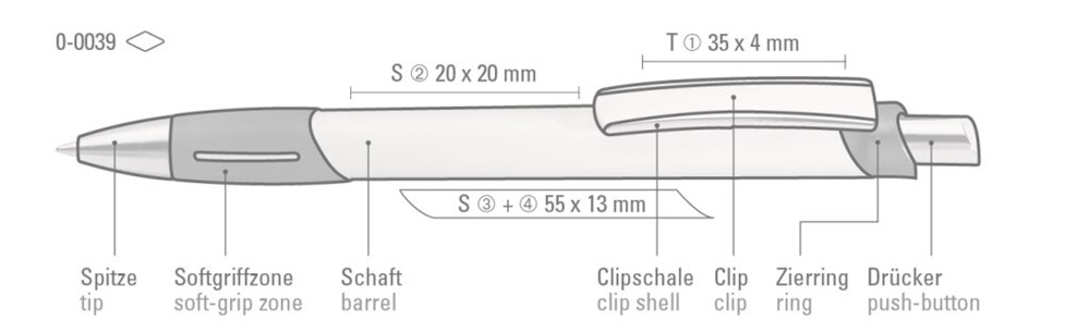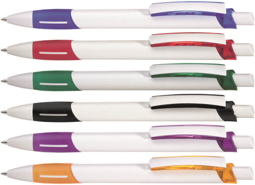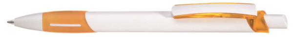 Druckkugelschreiber mit gedeckt weißem Gehäuse, transparent gefrosteter Gummigriffzone, Zierring und Clipschale.