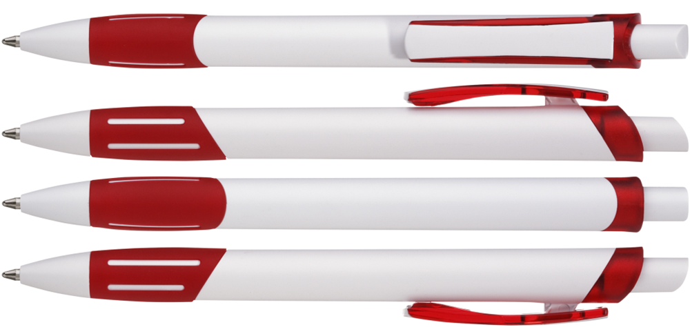 Druckkugelschreiber mit gedeckt weißem Gehäuse, transparent gefrosteter Gummigriffzone, Zierring und Clipschale.