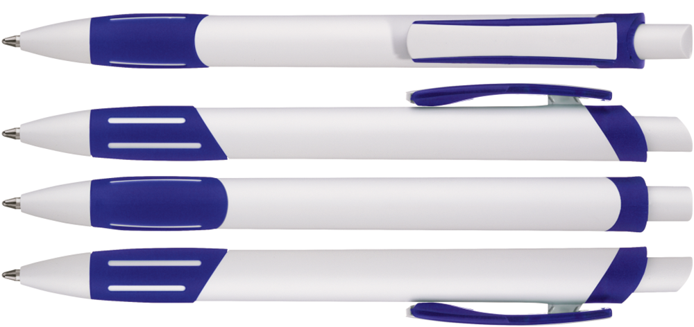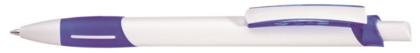 Druckkugelschreiber mit gedeckt weißem Gehäuse, transparent gefrosteter Gummigriffzone, Zierring und Clipschale.