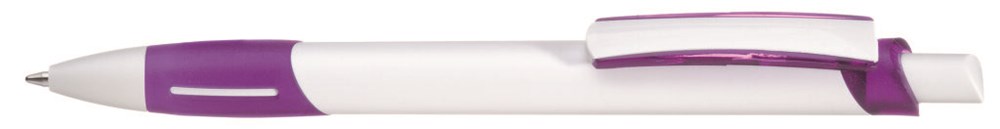 Druckkugelschreiber mit gedeckt weißem Gehäuse, transparent gefrosteter Gummigriffzone, Zierring und Clipschale.