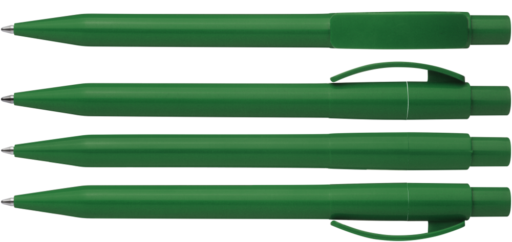 Druckkugelschreiber mit gedeckt glänzendem Gehäuse, Bogenclip und Drücker.