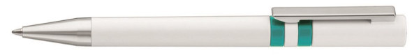 Drehkugelschreiber mit gedeckt glänzendem Gehäuse in weiß, farbig eingelassene Ringe und Stopfen im Oberteil. Metallclip und Spitze in silber glänzend.