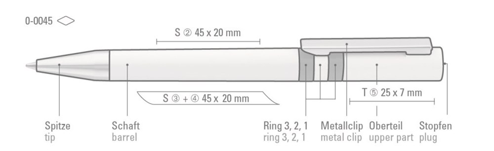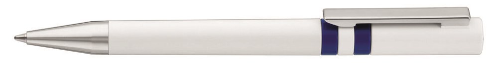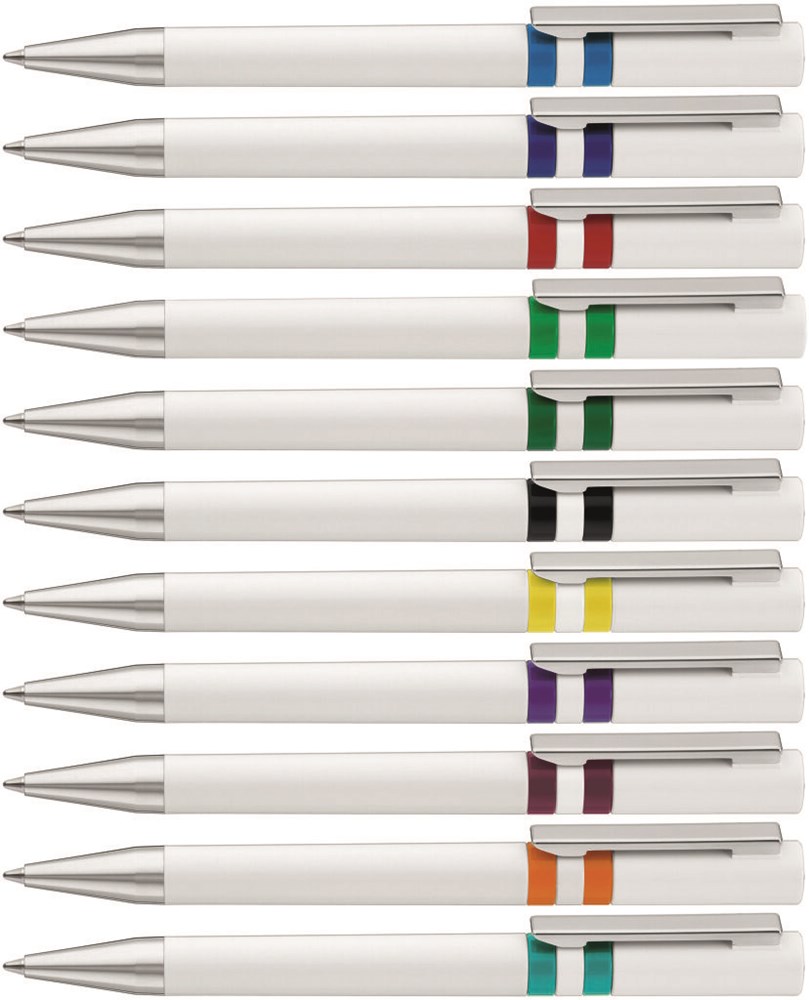 Drehkugelschreiber mit gedeckt glänzendem Gehäuse in weiß, farbig eingelassene Ringe und Stopfen im Oberteil. Metallclip und Spitze in silber glänzend.