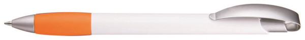 Druckkugelschreiber mit gedeckt glänzendem Gehäuse, Gummigriffzone, matt verchromtem Metallclipdrücker und Spitze matt silber.
