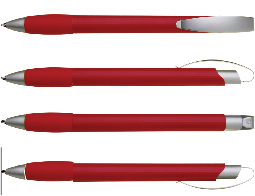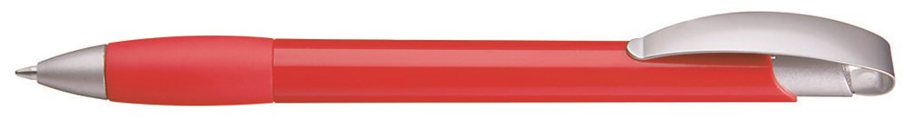 Druckkugelschreiber mit gedeckt glänzendem Gehäuse, Gummigriffzone, matt verchromtem Metallclipdrücker und Spitze matt silber.