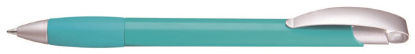 Druckkugelschreiber mit gedeckt glänzendem Gehäuse, Gummigriffzone, matt verchromtem Metallclipdrücker und Spitze matt silber.