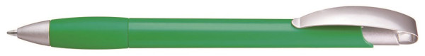 Druckkugelschreiber mit gedeckt glänzendem Gehäuse, Gummigriffzone, matt verchromtem Metallclipdrücker und Spitze matt silber.