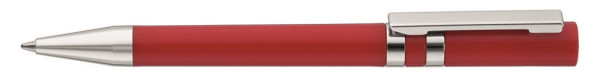 Drehkugelschreiber mit gedeckt glänzendem Gehäuse. Eingelassene Ringe, Stopfen im Oberteil, Metallclip und Spitze in silber glänzend.