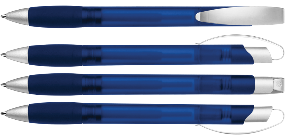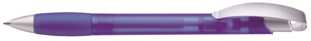 Druckkugelschreiber mit transparent gefrostetem Gehäuse, Gummigriffzone, matt verchromtem Metallclipdrücker und Spitze matt silber.