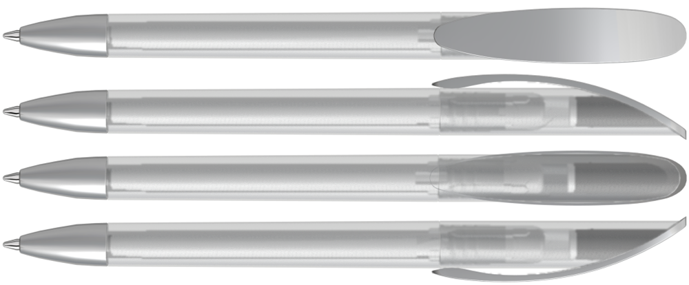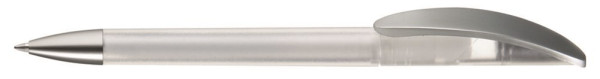 Drehkugelschreiber mit transparent gefrostetem oder gedeckt mattem Gehäuse, Bogenclip silber matt und schwerer Metallspitze matt verchromt.