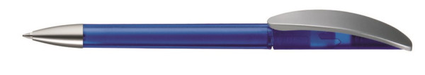 Drehkugelschreiber mit transparent gefrostetem oder gedeckt mattem Gehäuse, Bogenclip silber matt und schwerer Metallspitze matt verchromt.