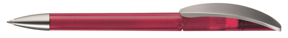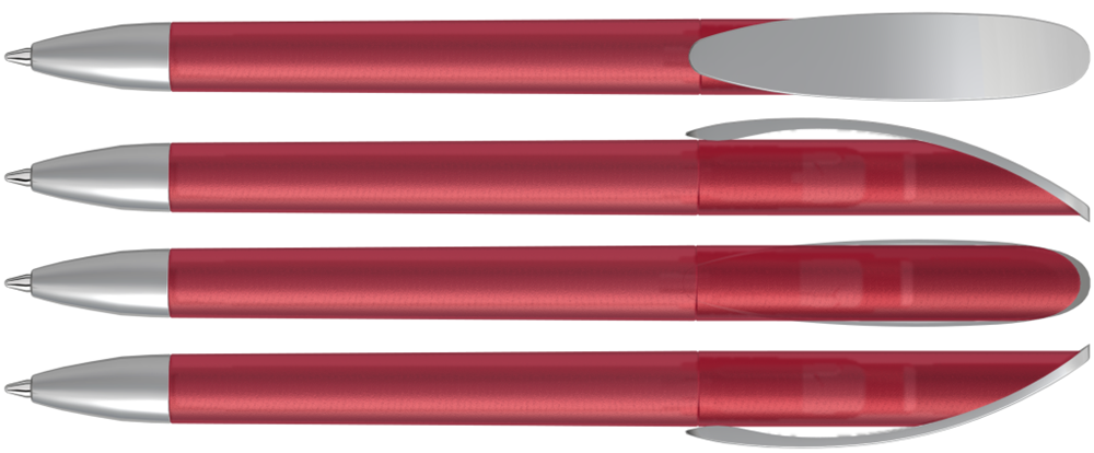Drehkugelschreiber mit transparent gefrostetem oder gedeckt mattem Gehäuse, Bogenclip silber matt und schwerer Metallspitze matt verchromt.