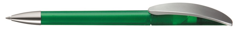 Drehkugelschreiber mit transparent gefrostetem oder gedeckt mattem Gehäuse, Bogenclip silber matt und schwerer Metallspitze matt verchromt.