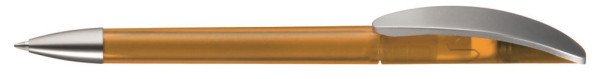 Drehkugelschreiber mit transparent gefrostetem oder gedeckt mattem Gehäuse, Bogenclip silber matt und schwerer Metallspitze matt verchromt.