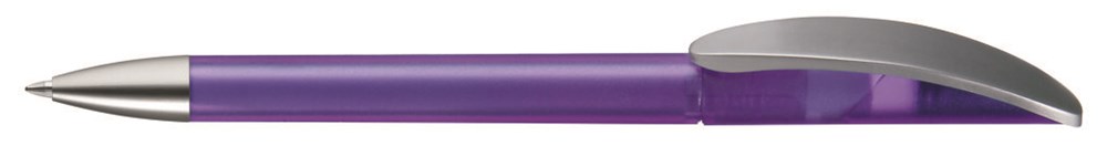 Drehkugelschreiber mit transparent gefrostetem oder gedeckt mattem Gehäuse, Bogenclip silber matt und schwerer Metallspitze matt verchromt.