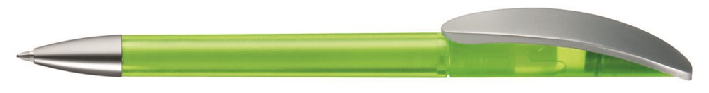 Drehkugelschreiber mit transparent gefrostetem oder gedeckt mattem Gehäuse, Bogenclip silber matt und schwerer Metallspitze matt verchromt.