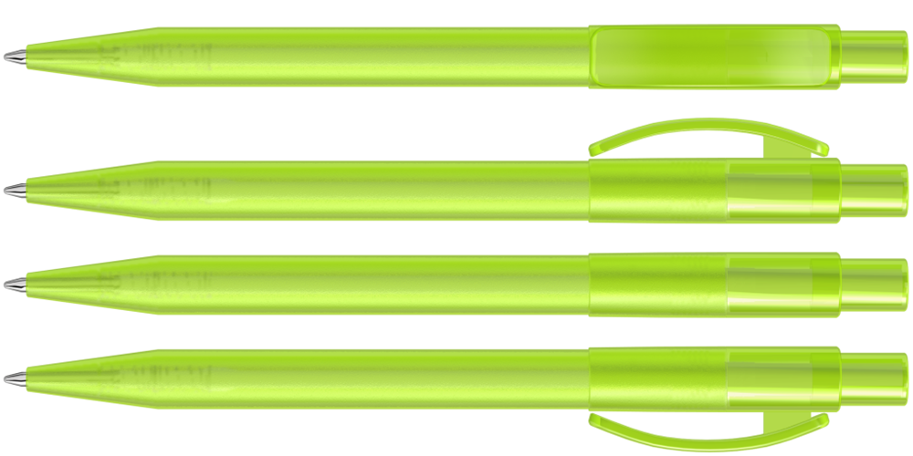 Druckkugelschreiber mit gefrostetem Gehäuse, glänzend transparentem Bogenclip und Drücker. mehr