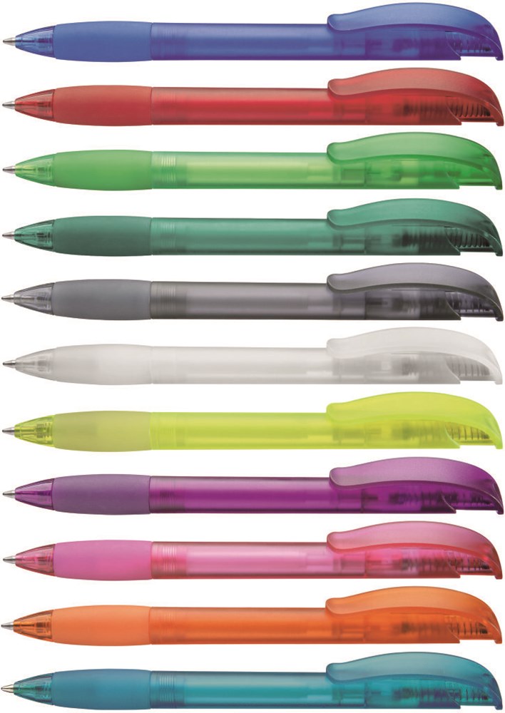 Druckkugelschreiber mit transparent gefrostetem Gehäuse, Gummigriffzone und Clipdrücker mit Stopfen.