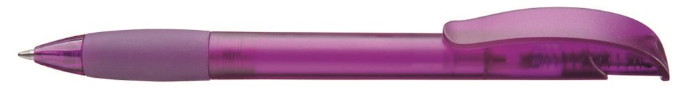 Druckkugelschreiber mit transparent gefrostetem Gehäuse, Gummigriffzone und Clipdrücker mit Stopfen.