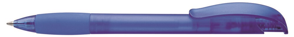 Druckkugelschreiber mit transparent gefrostetem Gehäuse, Gummigriffzone und Clipdrücker mit Stopfen.