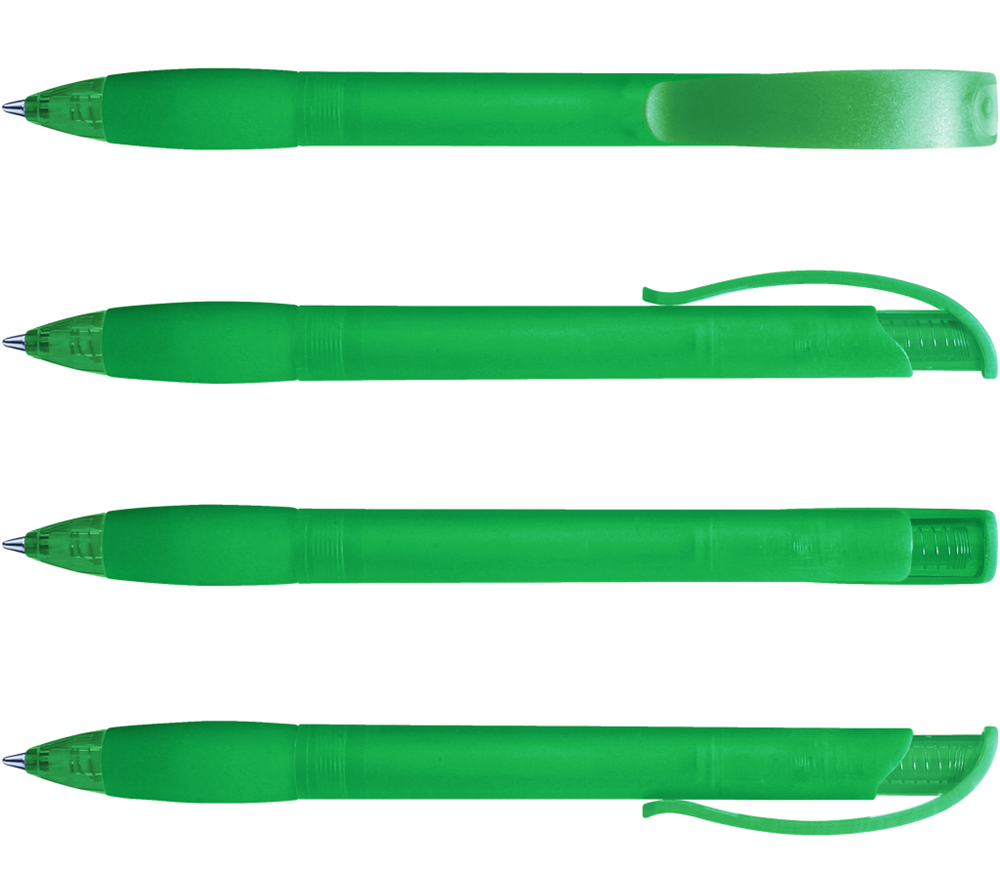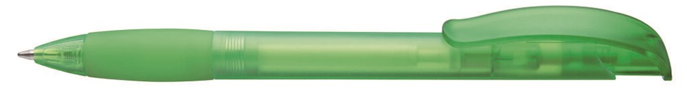 Druckkugelschreiber mit transparent gefrostetem Gehäuse, Gummigriffzone und Clipdrücker mit Stopfen.