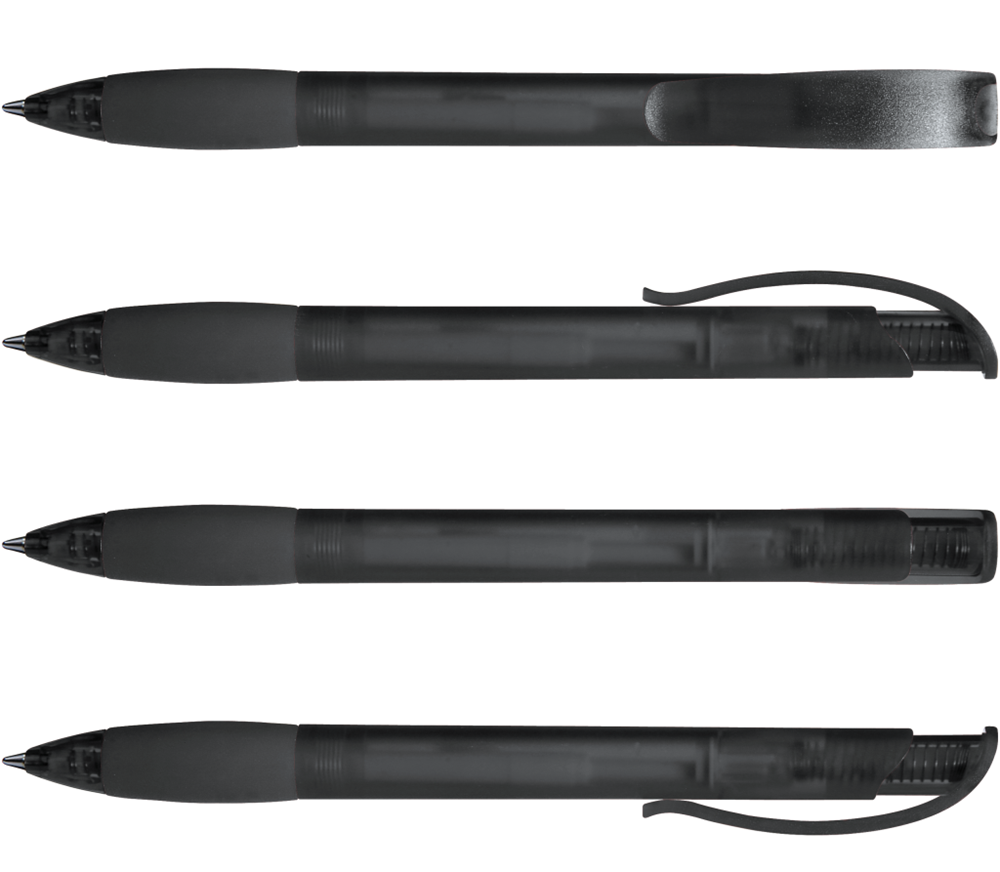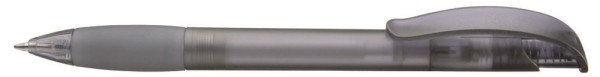Druckkugelschreiber mit transparent gefrostetem Gehäuse, Gummigriffzone und Clipdrücker mit Stopfen.